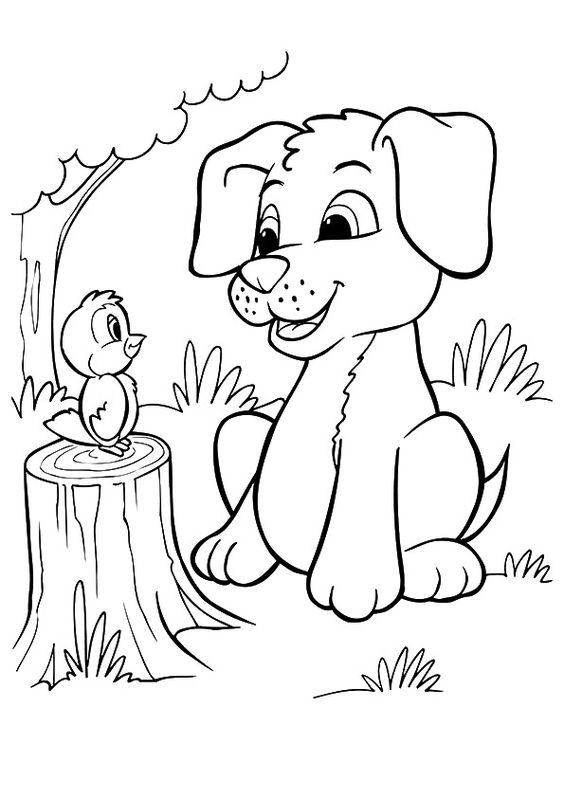 Tranh tô màu chó con và con chim
