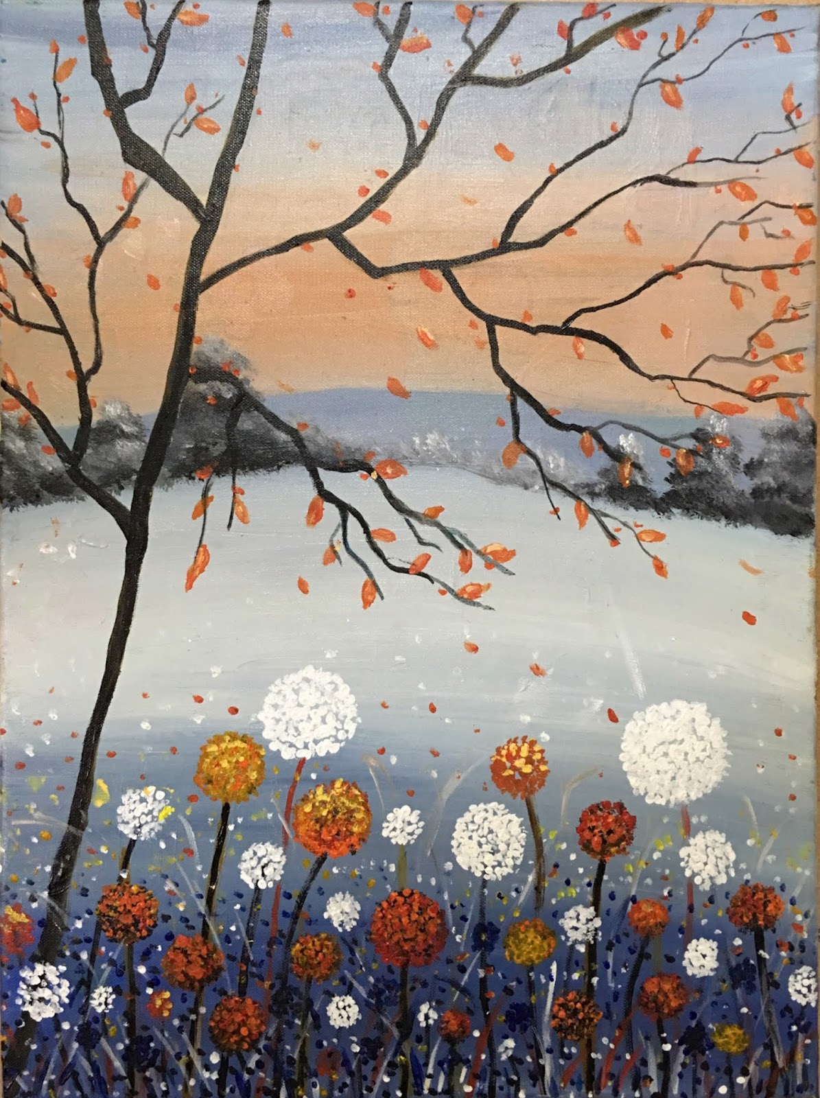 Tranh về mùa thu vẽ bằng màu acrylic, kích thước 30×40 cm
