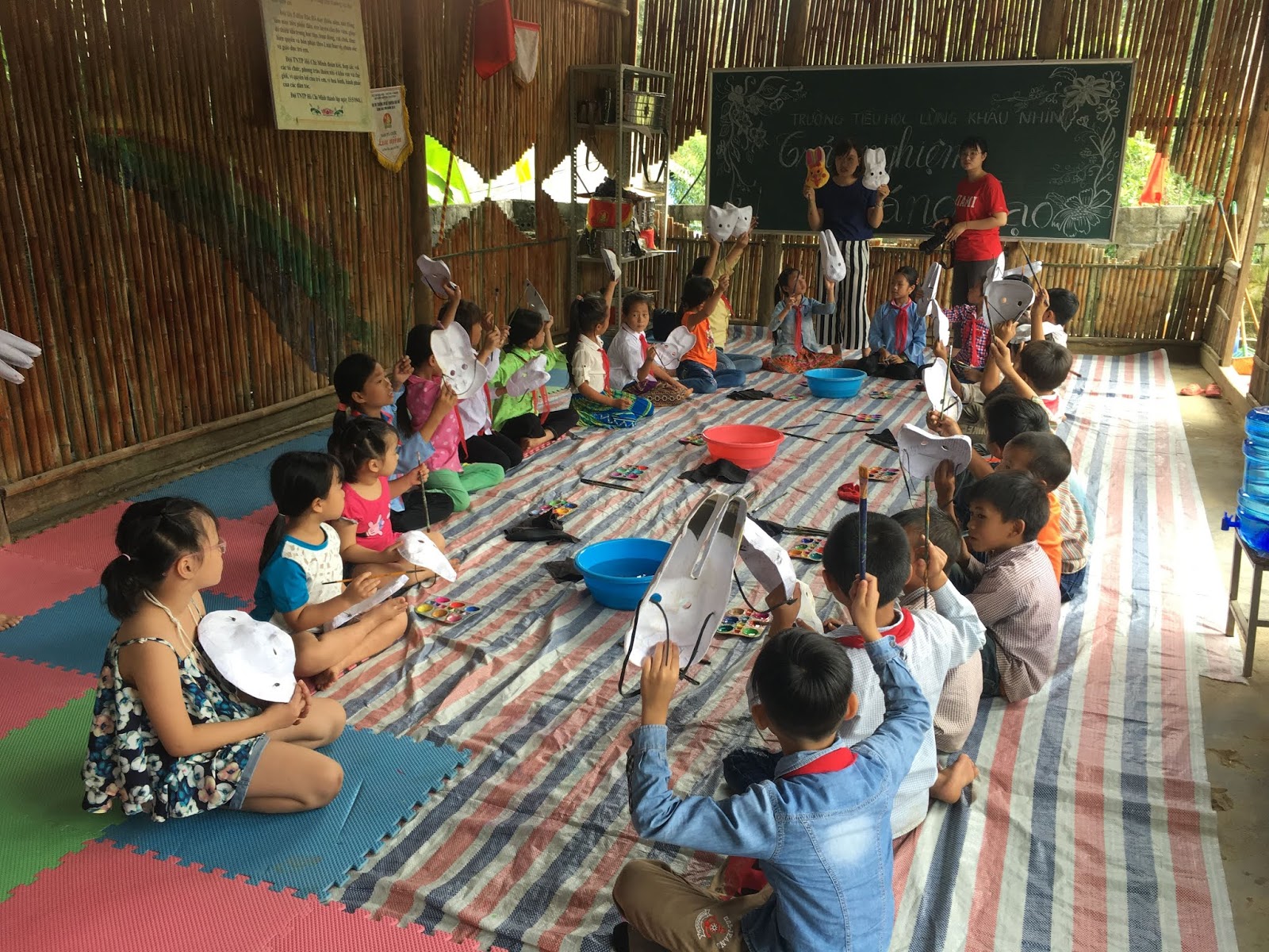 Đây là lần đầu tiên các em được cầm cọ vẽ, ánh mắt chăm chú, đưa những nét đưa cọ nắn nót tuy còn gượng gạo nhưng luôn với tinh thần tập trung cao độ. Rồi những chiếc mặt nạ giấy, cũng là lần đầu tiên các em được trang trí, dần hiện lên thật đẹp với nhiều màu sắc rực rỡ.